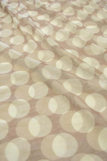 Вышивка на сетке, бежевые бантики на белом фоне. Сетка средней жесткости, мягкая и пластичная, неплохо тянется. Идеальна для пышных юбок-пачек, свадебных и вечерних платьев, бальных нарядов. Ткань легкая и воздушная, прекрасно подходит для многослойных изделий. Рекомендуем использовать в качестве основы под сетку натуральный шелк белого или молочного оттенка. Нежный дизайн, который изумительно будет смотреться на фигуре, подчеркивая женственность и изящность.