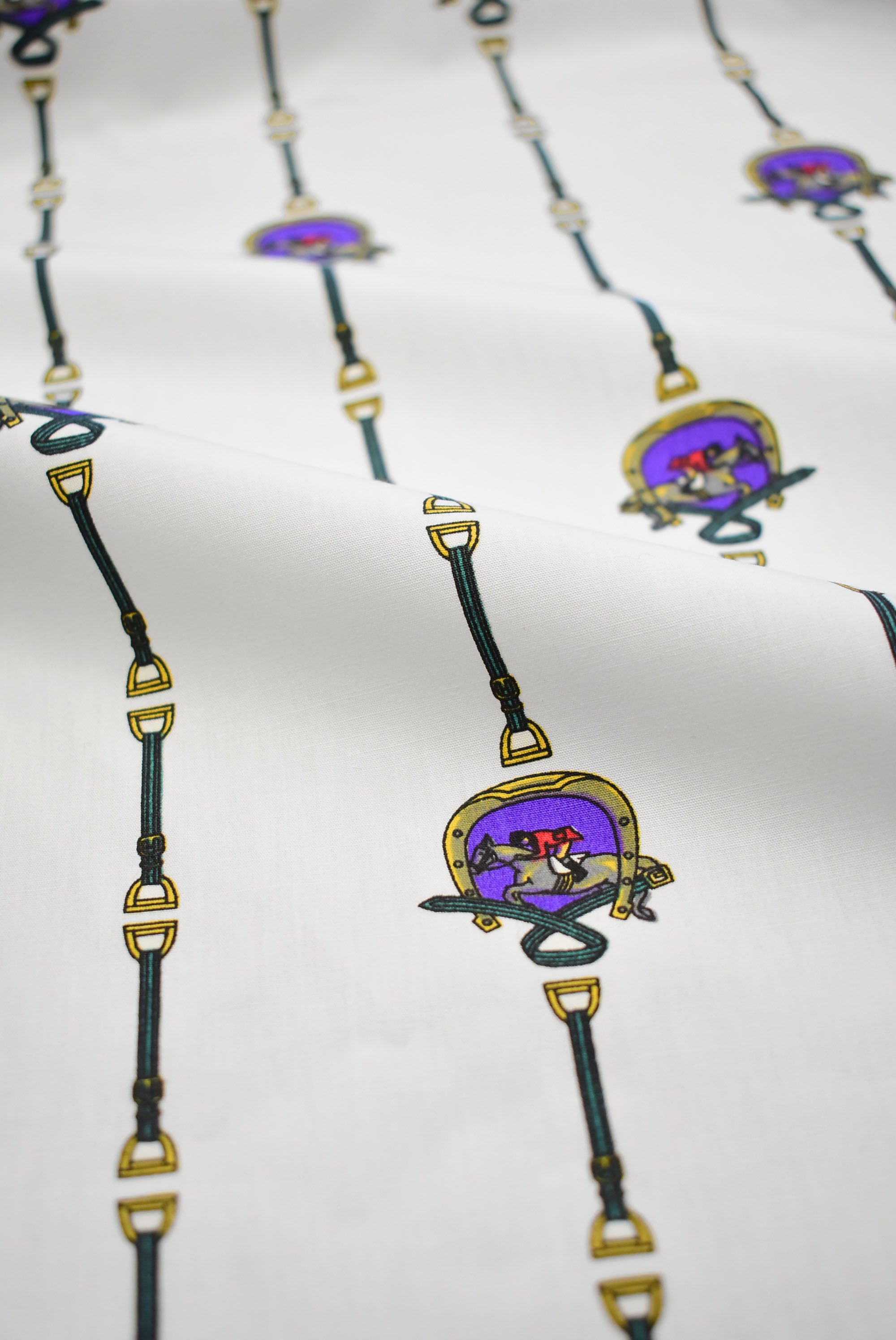 Хлопковая ткань белого цвета с ремешками и подковами. Плетение плотное, но несмотря на это хлопок мягкий и пластичный. Текстура матовая, гладкая и приятная на ощупь. Рисунок вертикальный, расположен вдоль кромки, визуально стройнит и вытягивает фигуру. Полотно прекрасно смотрится в прямых платьях и сарафанах, приталенных силуэтах, а также в изделиях с драпировками. Подойдет для классических рубашек и нарядов в романтическом стиле. Ralph Lauren