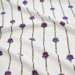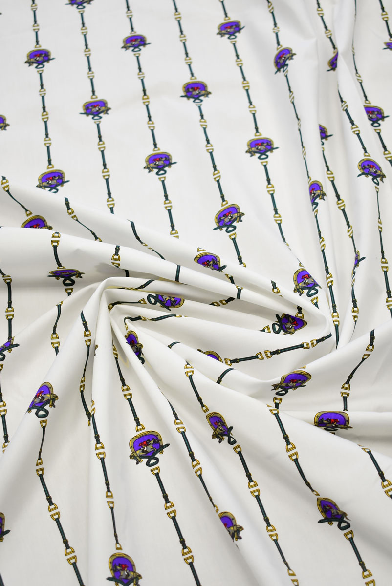 Хлопковая ткань белого цвета с ремешками и подковами. Плетение плотное, но несмотря на это хлопок мягкий и пластичный. Текстура матовая, гладкая и приятная на ощупь. Рисунок вертикальный, расположен вдоль кромки, визуально стройнит и вытягивает фигуру.