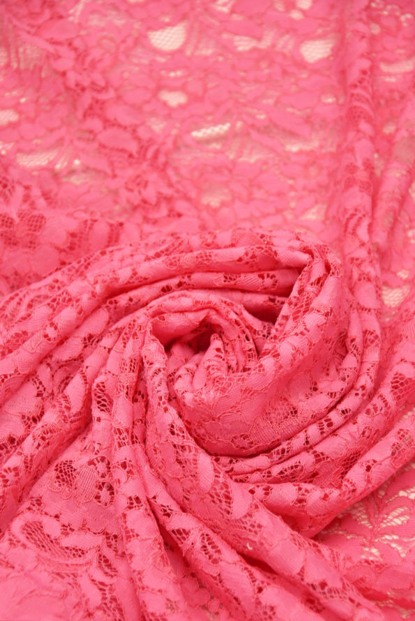 Роскошное сутажное кружево ярко-розового цвета. Флористический узор украшен сутажной нитью, благодаря которой полотно имеет красивую рельефность. Немного тянется, мягкое, хорошо драпируется, не держит форму. Прекрасно выглядит и может украсить платье, блузку, бюстье или превратиться в шикарный жакет.Используйте для пошива вечерних изделий или для отделки готовых нарядов.