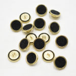 Пуговицы, обтянутые черной матовой тканью в изящной золотой оправе. Плоские, на ножке. Средний размер и лаконичный дизайн пуговиц будут хорошо смотреться на любой одежде — повседневные кофточки и платья, блузки и юбки, а также в классическом жакете, костюме.