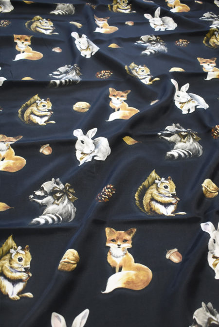 Твил с животными на черном фоне. Легкий, пластичный, с красивым атласным блеском. Ткань с хорошей плотностью, не просвечивает, очень мягкая, красиво драпируется и ниспадает. Подойдет для женственных платьев и сарафанов, блузок, туник, юбок, халатов. Прекрасно смотрятся блузки на запах с широкими рукавами по типу кимано, свободные брюки, комбинезоны, шорты и др. Подойдет для повседневных и нарядных изделий. Материал приятный к телу, комфортный.