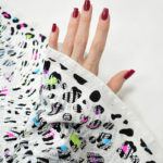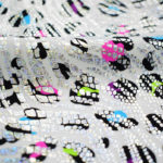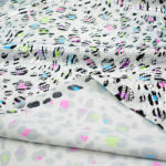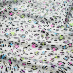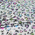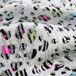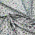 Трикотаж с разноцветным хищным принтом и серебристым напылением. Плотный, хорошо драпируется и отлично тянется. Благодаря этим особенностям ткань хорошо садится по фигуре и красиво облегает. Не просвечивает, поэтому можно не использовать подклад. За счет блестящего глиттера трикотаж мерцает и выглядит нарядно. Такой материал подойдет для футболки, майки, юбки, платья, боди, кофточек.