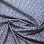 Жаккард синего цвета с белыми буквами F. Имеет красивую гладкую фактуру и умеренный блеск. Полотно тонкое и легкое, средней плотности, хорошо драпируется, мягкое, пластичное. Из этого материала можно сшить рубашку, платье и юбку, брюки, костюм.